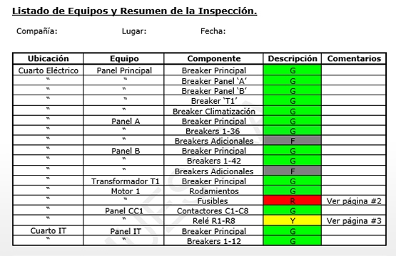 - Listado de los equipos inspeccionados: aquí podría indicarse el nombre de todos los paneles, equipos y/o dispositivos inspeccionados, así como la ubicación de los mismos. En esta sección se podría indicar los equipos que estaban en funcionamiento y pudieron ser inspeccionados, también podría indicarse los equipos a los que no se pudo acceder, que no se pudieron inspeccionar y/o que estaban fuera de funcionamiento al momento de la inspección. Se podría también indicar el estado de funcionamiento de cada equipo que fue inspeccionado con termografía.