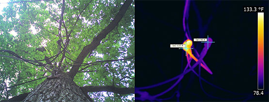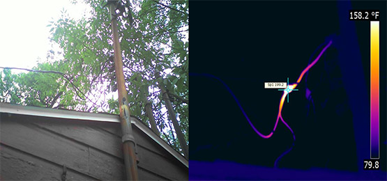 This particular disconnect won the Highest Temperature for a Disconnect Award (a very prestigious honor…)! There were 99 runners up, too. Not only did I inspect all the disconnects, there were utility pole connections, connections in mid-air, and conductors stapled to trees.