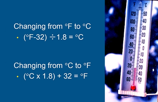 As part of our discussion of temperatures, we discuss the relationship between Fahrenheit, Celsius, and how to convert from one scale to another. The formula for converting Fahrenheit to Celsius is (F-32) ÷ 1.8. When converting from Celsius to Fahrenheit the formula is (C X 1.8) +32. Also, we discuss the conversion of temperature difference from one scale to the other using the value of 1.8 as a multiplier or divisor.