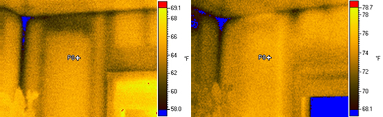 While the wind and sun will impact the patterns detected on the outside of the structure, they can also impact what’s seen on the inside. It’s important therefore to know not just where the sun is at the time of the inspection, but where it’s been in the time before the inspection. Solar exposure to exterior surfaces, as discussed earlier, can result in a reversal in the direction of transfer, overcoming the effect of the interior to exterior Deltas. In the images below, there was virtually no outside air temperature change, but the sun was on the exterior surface. In the first image (left) the pattern associated with settled blown cellulose insulation is apparent. In the later image (six hours after the first) the solar loading on the exterior was sufficient to reverse the pattern previously seen.