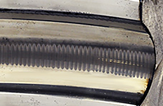 Fluting is the result of shaft currents in an electrical motor going to ground through the motor bearings. This problem is most often found with drive systems, however, welding operations in the area can cause this if the motor shaft becomes part of the ground path. Fluting may also be caused by welding on piping systems if the welding ground is connected to the building steel instead of the piping being welded. The ground path may go through the pump shaft, then the coupler, into the motor shaft, and finally through the bearings to ground.