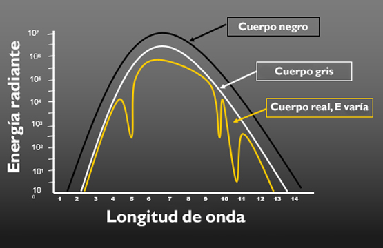 La emisividad superficial es muy dinámica y podría ser impactada por muchos factores. La emisividad de un cuerpo negro infrarrojo se asume como constante a través de toda la longitud de onda y para todas las temperaturas, por lo que cuando asignamos emisividades a superficies reales asumimos lo mismo. El término ‘Cuerpo Gris infrarrojo’ es el nombre que se le da a una superficie con emisividad menor a 1.0 y se asume que al igual que en un cuerpo negro infrarrojo este posee un valor constante de emisividad para todas las longitudes de onda y las temperaturas. Las superficies reales son lo que en la física se refiere como ‘Cuerpos Reales’ o ‘Cuerpos Espectrales’, donde la emisividad de un cuerpo real varia dependiendo la longitud de onda y la temperatura, como se muestra en la gráfica a continuación (con línea amarilla).