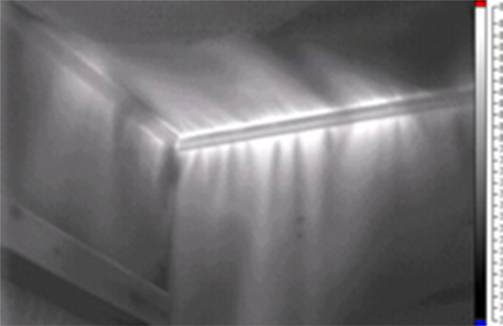 A convection (air leakage) inspection should be conducted after the insulation (conduction) inspection is completed. The best method for doing an air leakage inspection is to control the flow direction through the building. Relying on natural convection can be problematic as the neutral plane in the structure is not readily apparent. We are not saying that it cannot be done but, the natural airflow and construction of the building must be understood. In most structures, air enters at the bottom or ground level and exits at the top of the building at the soffit or roofline sometimes referred to as the stack effect. You have to be on the side that the air is moving to, not coming from. The best method is to create a controlled pressure difference from outside to inside, either using a blower door, the building’s exhaust fans, or even a box fan in the window. The goal is to put the inside of the building in a negative or vacuum as compared to the outside, drawing the outside air into the building, making your inspection point from inside of the building. We can do the opposite as well, putting the building into a positive pressure condition. But the flow direction and the temperature differences must be understood. As with the insulation inspection, there is a recommended minimum ΔT (temperature difference) from inside air to the outside air of 9°F (18°F for the insulation inspection). From what I have seen it seems to be easier to detect the effects of cooler air across a surface than warm air. (it may just be me) remember that we cannot “see” the air, just the effects of convection as it moves across the surface. Air is kind of like electricity, always seeking and taking the path of least resistance.