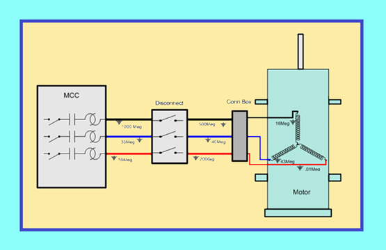 Resistance to ground anomalies can be some of the most difficult motor and motor circuit problems to assess. Given that all motor failure mechanisms result in an increase in motor operating temperature, ultimately insulation problems are the end result. The increased heat thermally degrades and embrittles the winding insulation treatments. Operating stresses, particularly motor starts can result in cracks in the insulation and degradation of resistance to ground.
