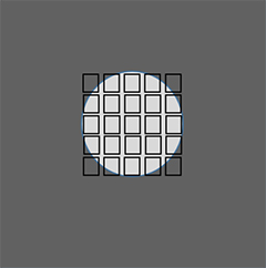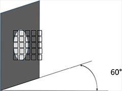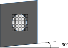 As the surface being inspected is viewed from larger and larger angles away from perpendicular, the apparent flaw size will decrease. Depending on orientation and/or geometries, these situations must be taken into consideration when creating inspection procedures with maximum allowable flaw sizes. In the sequence of pictures below we have simulated the number of detectors, or pixels, projected on a surface--no allowance has been made for the depth of the flaw. As can be seen, fewer and fewer pixels are actually receiving energy from the flaw as we increase the viewing angle from perpendicular up to 60°.