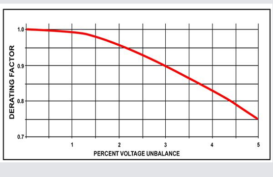 Unbalance voltage results in unbalanced current and torque. This causes motor operating temperature to increase. NEMA provides a derating chart to compensate for temperature increase, by load reduction. Using the derating chart at left; if you have a 5% voltage unbalance, you need to reduce motor loading by 25%.