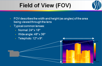 To understand spatial resolution, lets first explain Field of View (FOV). FOV is a measure of the angular view path of what an infrared camera sees. Usually measured in degrees, it determines the thermal imager’s overall viewing area and is defined by horizontal and vertical angles. The larger the angle, the bigger the field of view.