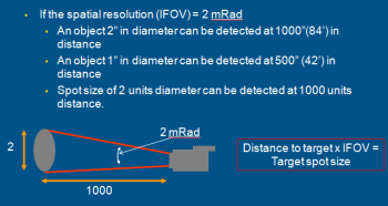 The Instantaneous Field of View (IFOV) describes the spatial resolution capability of the imager. Simply defined, IFOV is the smallest target size an infrared camera can discern at a given distance with a given lens type and detector size. It is usually specified in an imager’s technical data sheet as an angle of measurement in milliRadians or mRad. The smaller the mRad value, the narrower the viewing angle and the better the resolution of the camera (i.e. it can seesmaller objects at greater distances).