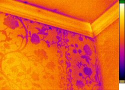 The class was held at a circa 1900 country inn that, besides having a number of expected insulation problems in the exterior walls, also had a variety of wallpaper styles throughout each guest room. In one of the first rooms we looked at there was this ornate floral pattern on the wall that did not show up thermally (Image 1, picture-in-picture, above right).