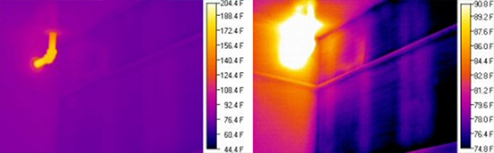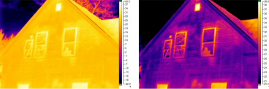 The same issue exists inside when the camera’s auto-adjust must deal with a hot steam pipe or radiator inside a building. Another example could be a cold window within the field of view. The problems seen here with insulation and air infiltration are obvious when the image is manually adjusted (below, at right), but are undetectable if one just stayed in auto mode and left the hot pipe in the field of view (image below left).