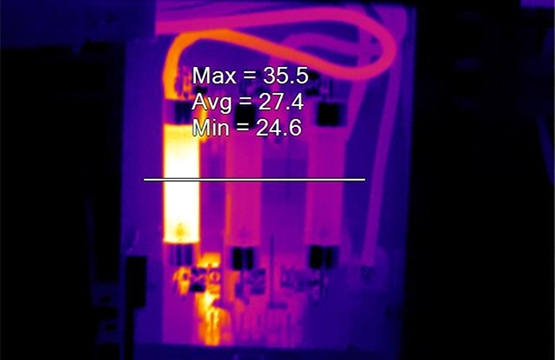 Medidor tipo Línea: Muchos de los softwares de análisis de las imágenes térmicas podrían contar con un medidor tipo ‘línea’ que permite dibujar una línea sobre los equipos o superficies donde se quiere medir la temperatura, el software podría también graficar las temperaturas a lo largo de dicha línea y podría proveer la temperatura mínima, máxima y promedio en la misma. Lo anterior podría ser útil para reportar o ilustrar variaciones de temperaturas en bandas o fajas y circuitos trifásicos como se puede ver en el ejemplo de la imagen de la parte de arriba.