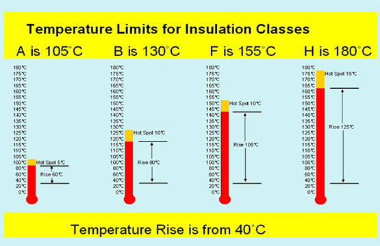There are four classes of insulation - A, B, F, and H - class F being the most used. These insulation classes were established to meet motor temperature requirements found in industrial applications. Class A is an older form of insulation utilizing organic varnishes and resins available many years ago. You also see class A insulation on a lot of older generators. Today it would only be seen in very old motors and would not be used for new or remanufactured motors.