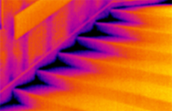 Cold air infiltration detected passing into this staircase from an exterior wall. This pattern was not present prior to running the blower door.