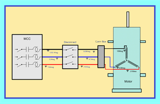 When conducting de-energized electric motor testing, connections are usually made at the motor “T” lead terminals in the motor starter. This provides for the evaluation of the motor and associated cabling. When presented with a ground anomaly or a resistance unbalance the first step is to localize the problem to the motor or cabling. If a disconnect is present in the circuit, it can provide an immediate point of isolation. Open the disconnect and retest from the load side of the open disconnect. If the problem is no longer present the problem is in the line side of the disconnect or within the interconnecting cabling. If the problem is still present, the problem is somewhere between disconnect and motor or in the motor. The next step would be opening the supply cables at the motor connection box. Conduct testing on the isolated motor. If the anomaly is present, the problem is in the motor. If the problem is not present it is in the cabling from the load side of the open disconnect. If the problem is a resistance imbalance it is most likely the disconnect terminals. Short all 3 cables together at the motor and measure the phase-to-phase resistance from the disconnect terminals. This will isolate the phase with the connection problem. If you measure 1-2, 1-3, and 2-3 the phase with the highest resistance measurements is the problem. For example, if 1-2 and 1-3 had higher resistance than 2-3, phase 1 is common to the higher resistance readings, the connection anomaly is in phase 1.