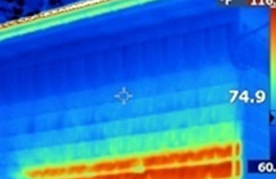 As the sun works its way across the skies, the shadows it casts can become long and influential. This is especially true on walls where a soffit or overhang can shade the upper part of a wall but not the lower. This is obvious to anyone looking at the exterior (above image), although even there you may see, thermally, the time lag of the moving shadow (see the shades of blue (image right) at the red line).