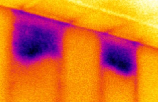 In another example, we see areas of apparent missing insulation from the interior without the aid of any temperature points, just the color scale where brighter indicates warmer and darker cooler. Of course, understanding the environmental conditions which are creating these patterns is important. In this case, it was a cold-weather situation, about 10°F outside. Putting spot temperatures on the image would add nothing of value here and would distract from the more important data point which is that we have located two apparent insulation voids.